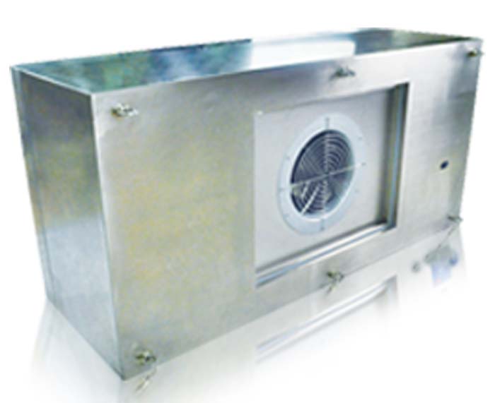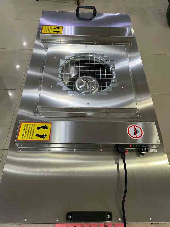 FFU層流罩設(shè)有初、高效兩級過濾裝置。風(fēng)機(jī)從頂部將空氣吸入并經(jīng)初效過濾器、高效過濾器進(jìn)行過濾,過濾后的潔凈空氣在整個(gè)出風(fēng)口送出。安裝方式有懸掛式和落地支架兩種。
