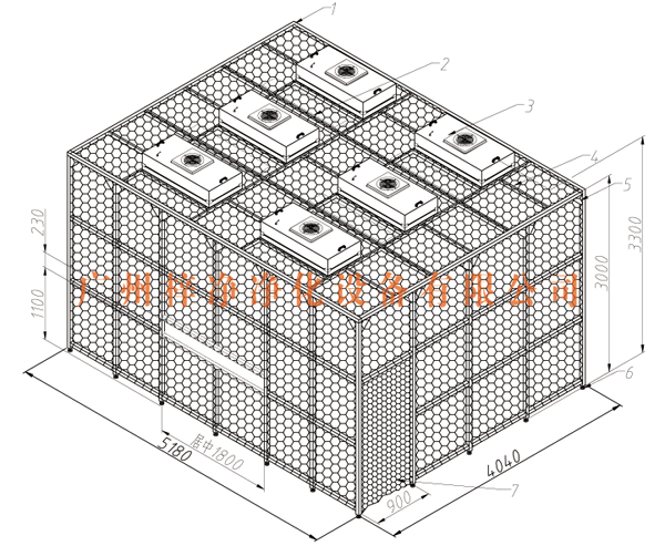 風機從FFU頂部將空氣吸入,經初效過濾器,高效過濾器過濾,過濾后的潔凈空氣在整個出風面以0.45m/s±20%的風速勻速送出到深圳無塵棚內。形成均流層,使?jié)崈艨諝鈿饬鞒蚀怪眴蜗蛄?,從而保證了工作區(qū)內所要求的潔凈度。