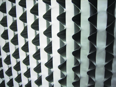 過(guò)濾器濾材兩面180度翻折,形成鍥形褶層。濾料折彎時(shí)有兩道壓痕,使其在隔板的尾端處形成鍥形盒式摺層,鍥形盒式褶層可以防止濾料破損。有些過(guò)濾器生產(chǎn)商采用了單壓痕或滾痕式濾料褶層,甚至簡(jiǎn)單地人工折紙,在這種惰況下,濾料很容易被波紋形隔板尖銳的折頂損壞。或在過(guò)多搬運(yùn)過(guò)程中損壞濾紙。